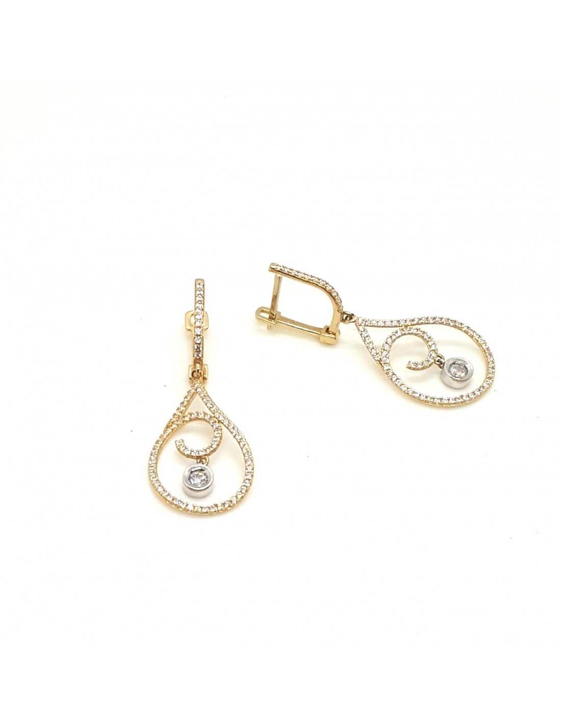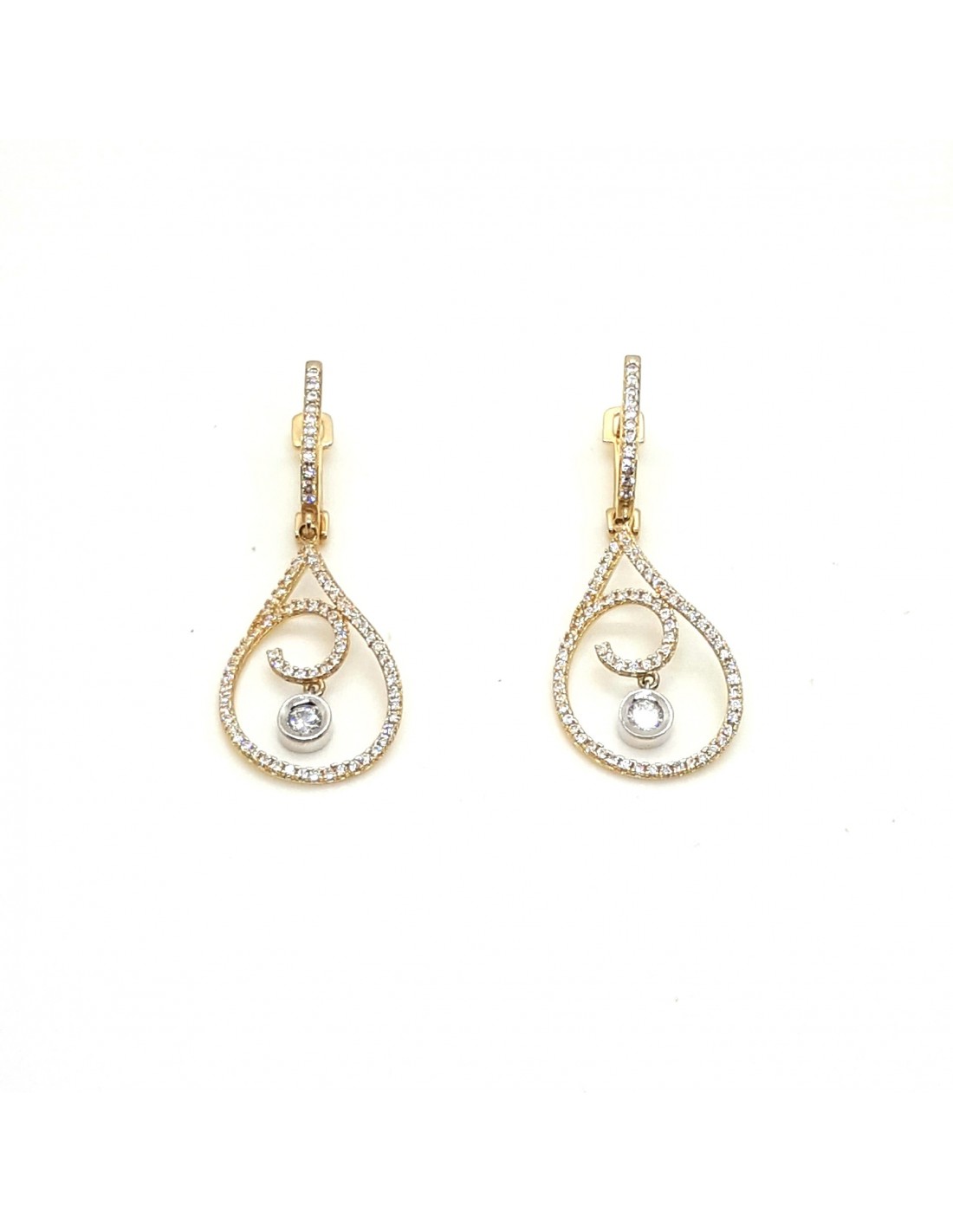 Σκουλαρίκια κρεμαστά με υπέροχο σχέδιο σταγόνα διακοσμημένα από πέτρες ζιργκόν, εσωτερικά έχει μια μεγαλύτερη πέτρα και σε όλη την επιφάνεια του κοσμήματος διακοσμούνται μικρές πέτρες ζιργκόν σε λευκό χρώμα.