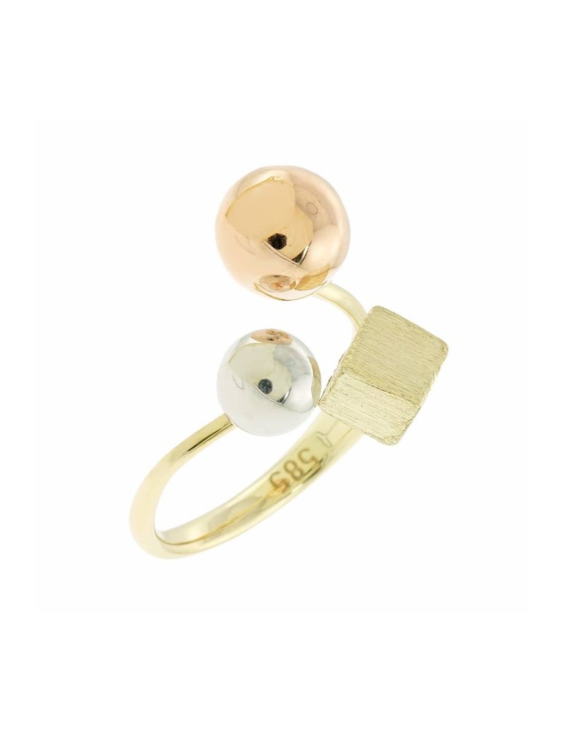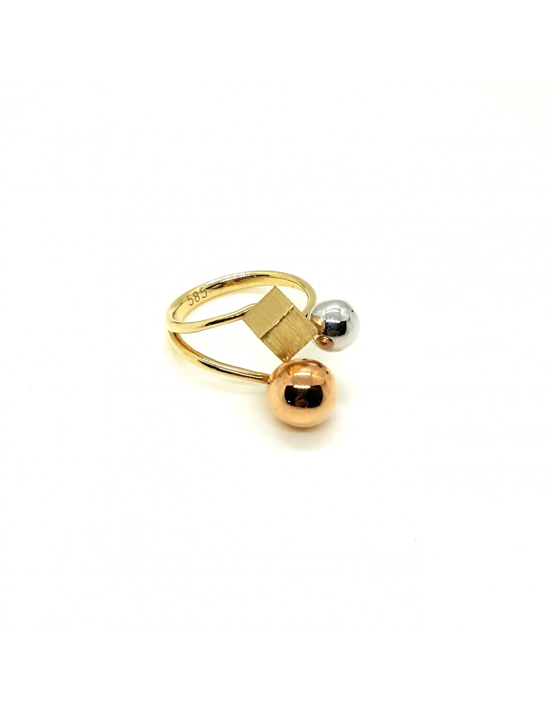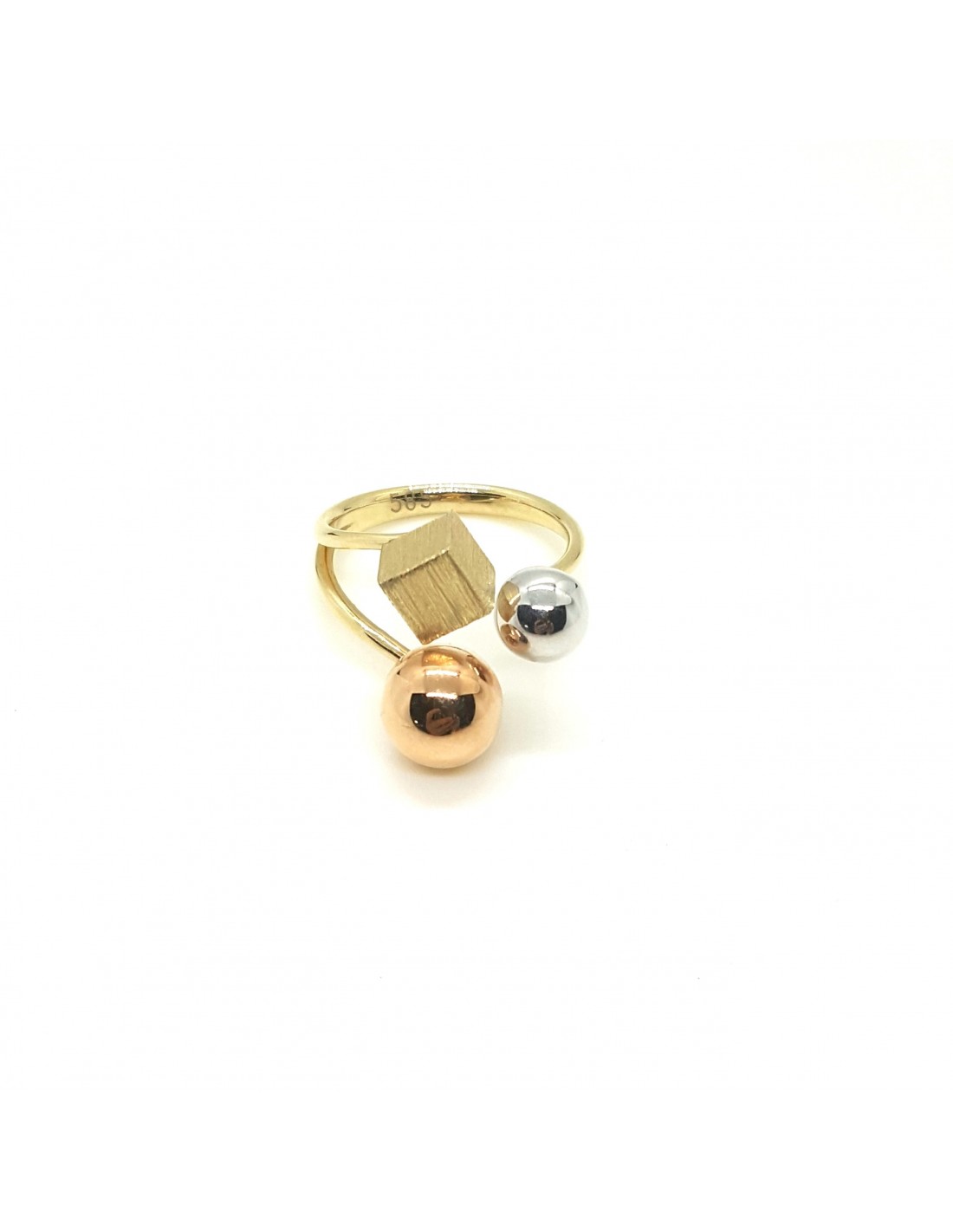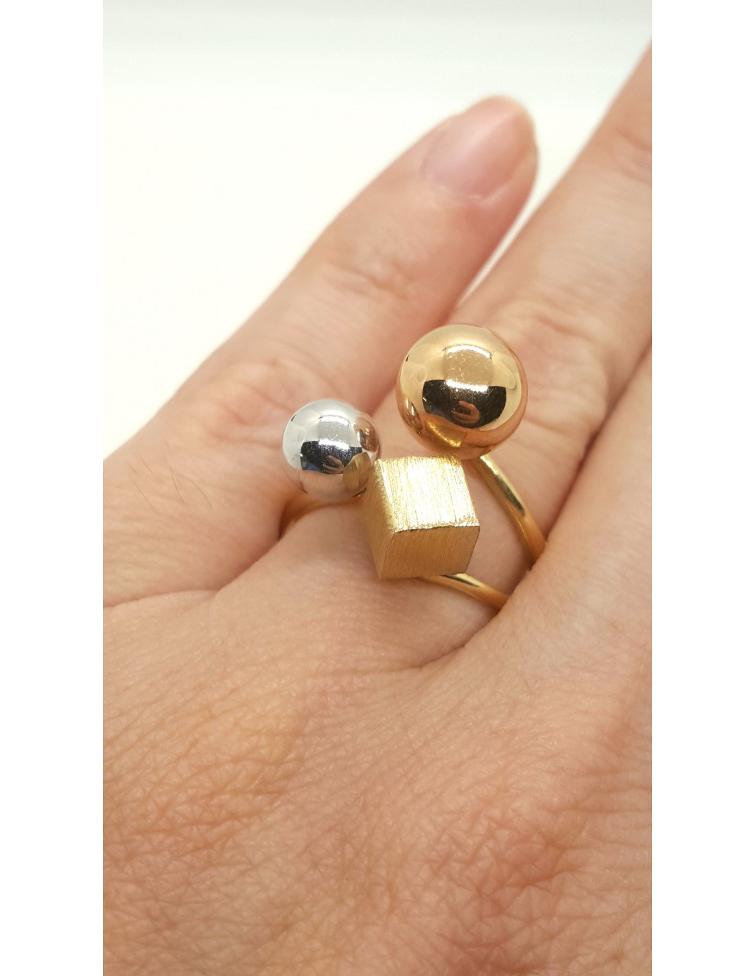 Κοσμήματα ΒαρουχάκηΠρωτότυπο δαχτυλίδι διακοσμημένο με γεωμετρικά σχέδια, μια λευκή μπίλια, κεντρικά κύβο και μια μεγαλύτερη χτυσή μπίλια.