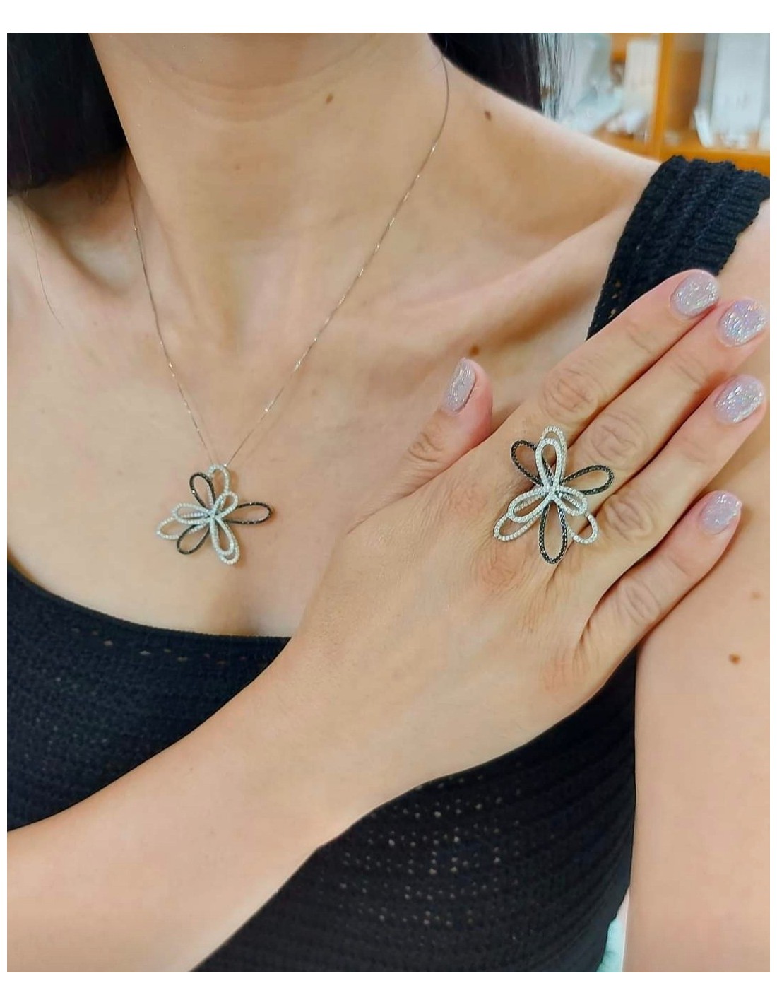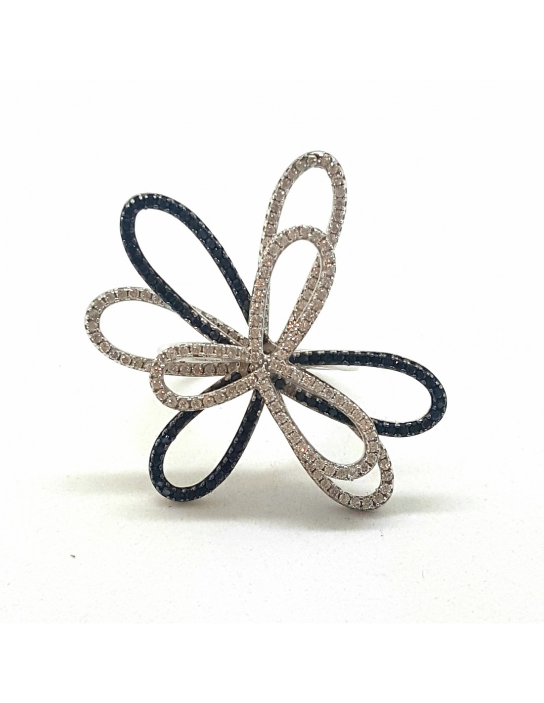 Κοσμήματα ΒαρουχάκηΔαχτυλίδι με λαμπερό και εντυπωσιακό σχέδιο λουλούδι κατασκευασμένο σε 14 καράτια 585, διακοσμείται με ζιργκόν πέτρες σε λευκό και μαύρο χρώμα.