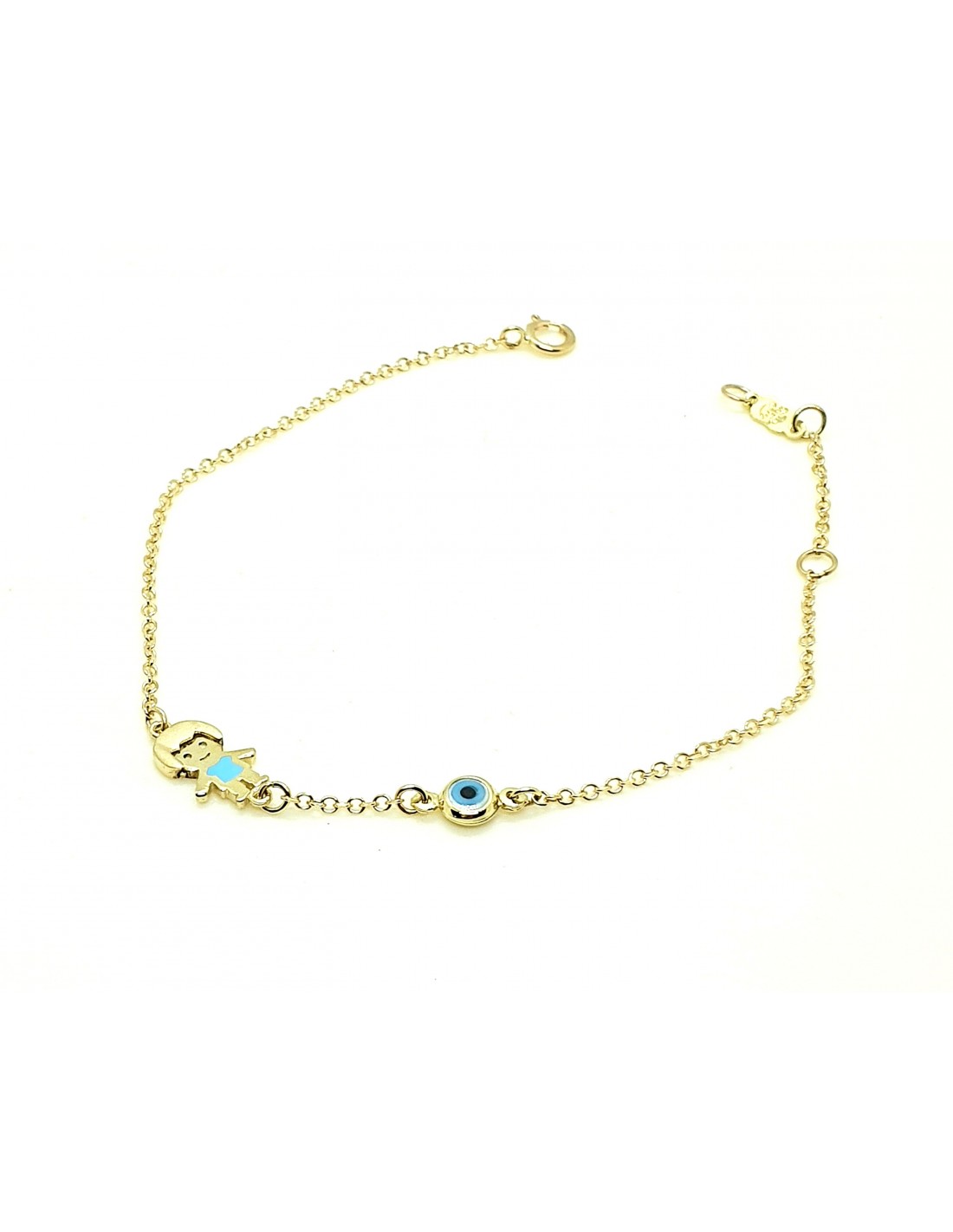 Κοσμήματα ΒαρουχάκηΜοντέρνο βραχιόλι για αγοράκι κατασκευασμένο σε 9 καράτια χρυσό. Διακοσμείται με σχέδιο αγόρι από μπλέ σμάλτο ένα ματάκι.