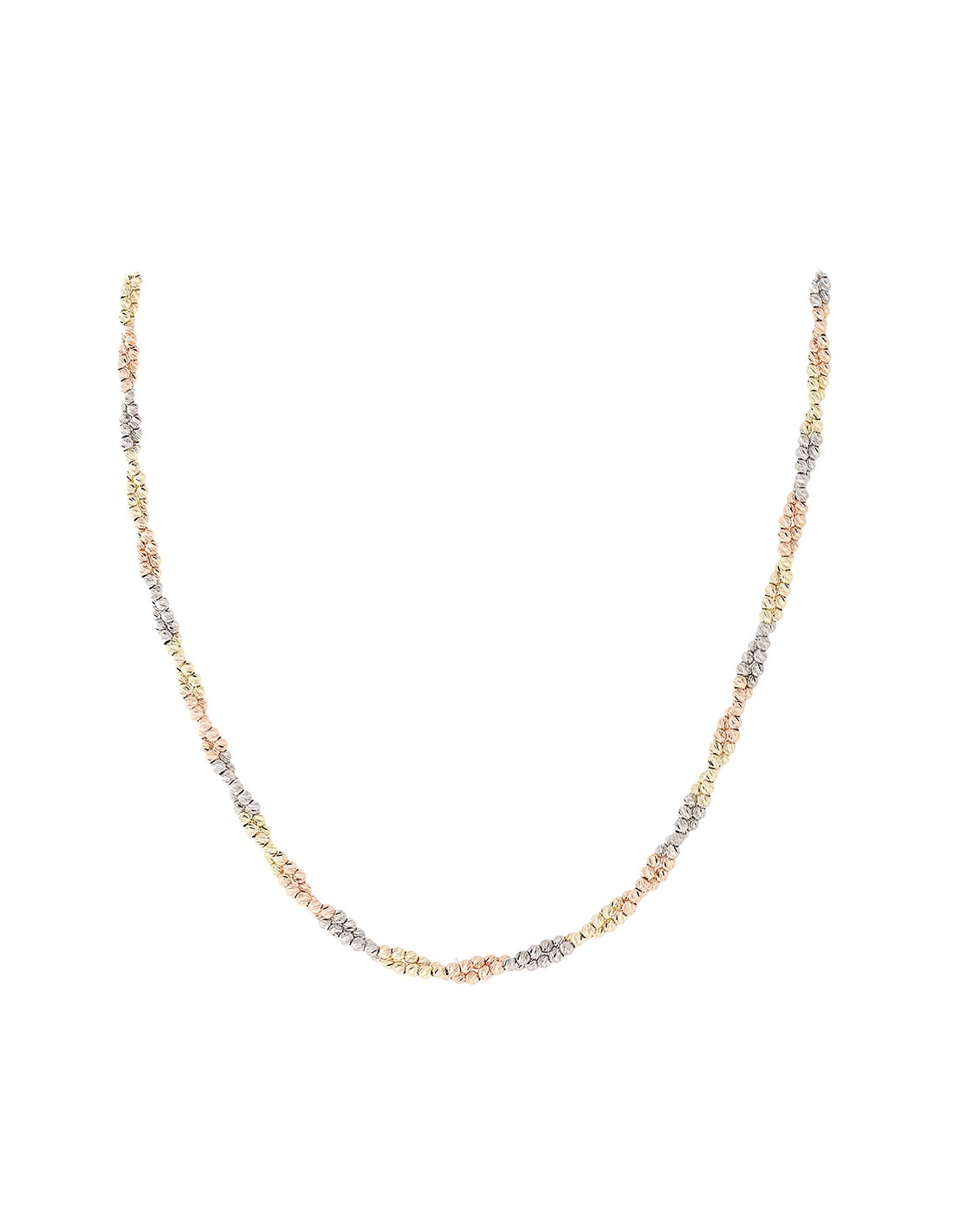 Κολιέ σε στριφτό σχέδιο γεμάτο από διαμανταριστές μπίλιες τριών χρωμάτων (κίτρινο, ροζ, λευκό) για υπέροχη λάμψη.