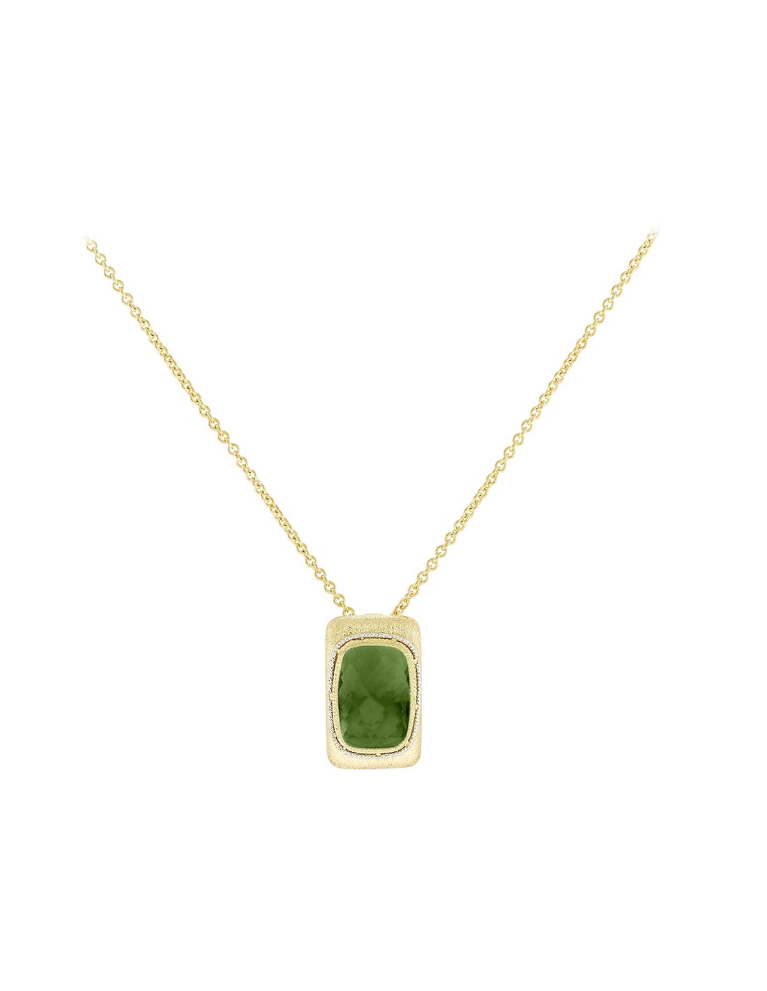 Εντυπωσιακό χρυσό Κ14 κολιέ σε ορθογώνιο ματ σχέδιο διακοσμημένο με πράσινη ζιργκόν πέτρα και περιμετρικά μικρές λευκές για περισσότερη λάμψη.