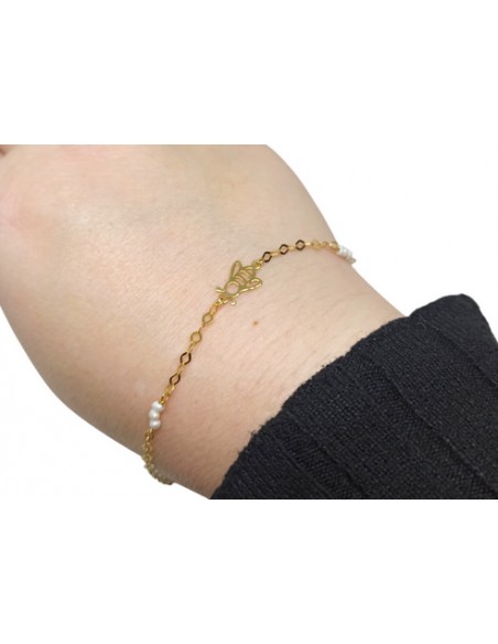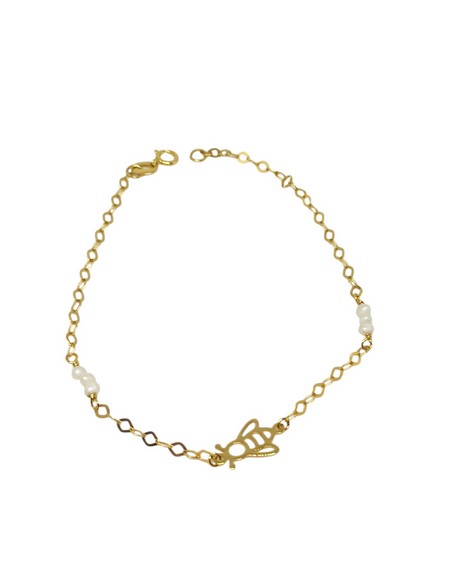 Λεπτεπίλεπτο βραχιόλι κατασκευασμένο από 14 καράτια χρυσό, διακοσμημένο κεντρικά με σχέδιο μέλισσα και μαργαριτάρια στο πλάι.