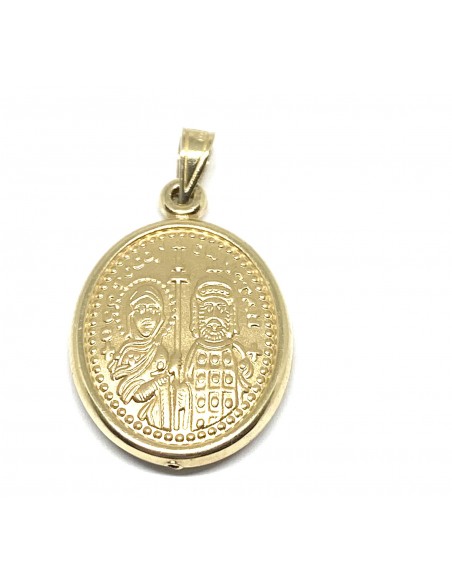 Κοσμήματα ΒαρουχάκηΤο κόσμημα της εικόνας είναι ένα οβάλ χρυσό μενταγιόν με θρησκευτικό χαρακτήρα, το οποίο φέρει την επιγραφή "IC XC NIKA" και έναν σταυρό. Αυτός ο σχεδιασμός είναι βαθιά συνδεδεμένος με την Ορθόδοξη Χριστιανική πίστη και συχνά χρησιμοποιείται ως φυλαχτό προστασίας ενώ από την άλλη πλευρά απεικονίζει τους Αγίους Κωνσταντίνο και Ελένη.
