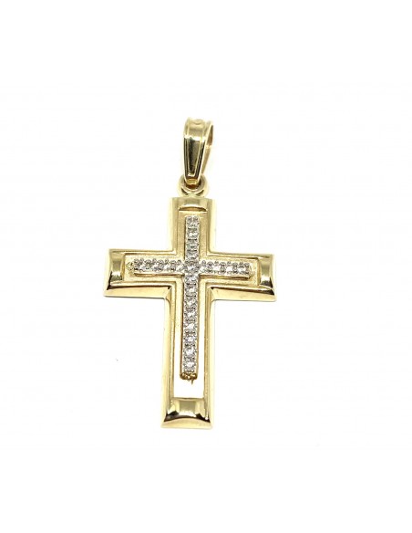Κοσμήματα ΒαρουχάκηΚομψός σταυρός από χρυσό 14 καρατίων, με λαμπερά λευκά ζιργκόν στο κέντρο που σχηματίζουν έναν διακριτικό σταυρό μέσα στο σταυρό.