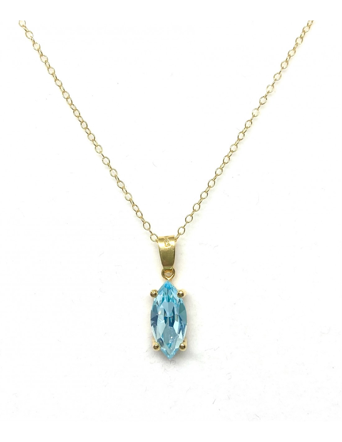 Λαμπερό και εκλεπτυσμένο, αυτό το κολιέ ξεχωρίζει με το εντυπωσιακό του ζιργκόν σε κοπή marquise, σε φωτεινή γαλάζια απόχρωση. Η πέτρα δένει αρμονικά με το επιχρυσωμένο δέσιμο και την κομψή λεπτή αλυσίδα, προσδίδοντας αίσθηση φινέτσας και φρεσκάδας.
