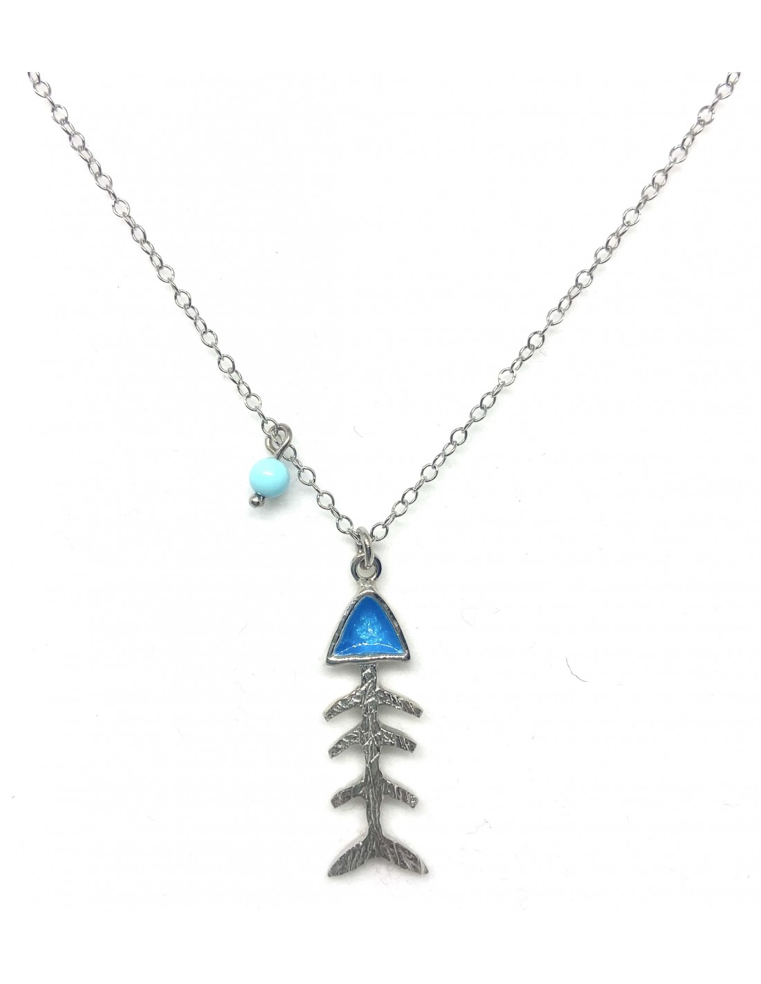 Ένα ξεχωριστό και παιχνιδιάρικο κόσμημα που ενσωματώνει την ανεμελιά του καλοκαιριού. Το μενταγιόν σε σχήμα ψαροκόκαλου από οξειδωμένο ασήμι συνδυάζεται με ένα τριγωνικό μπλε στοιχείο και μία μικρή τιρκουάζ χάντρα στην αλυσίδα. Ιδανικό για όσους λατρεύουν το boho, το φυσικό και το θαλασσινό στυλ.
