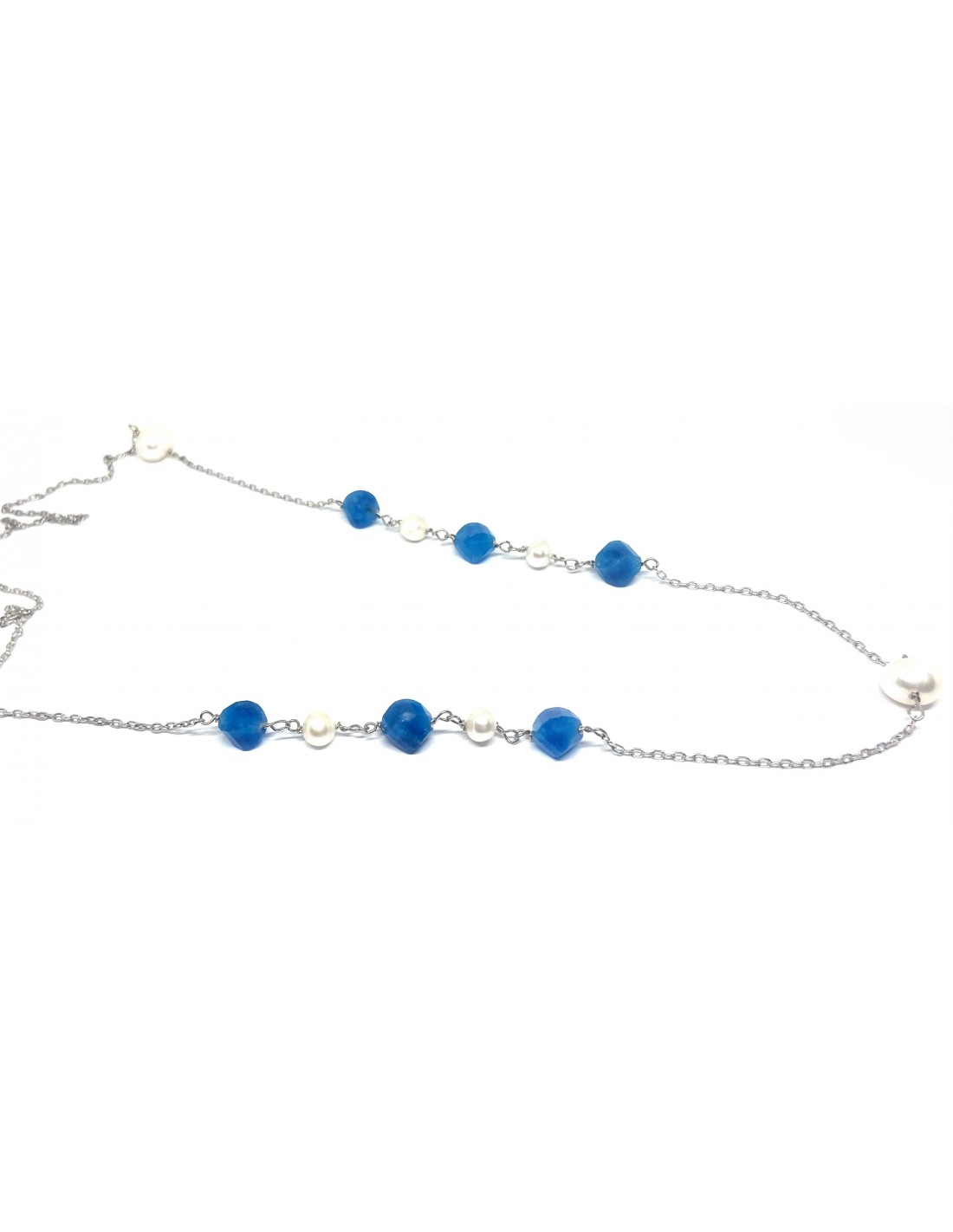 Κολιέ με κομψή αλυσίδα σε ασημένιο χρώμα, διακοσμημένο με φυσικά λευκά μαργαριτάρια και μπλε τυρκουάζ χάντρες κοπής facets. Ο συνδυασμός των υλικών αποπνέει φρεσκάδα, καλοκαιρινή διάθεση και ανεπιτήδευτη κομψότητα.