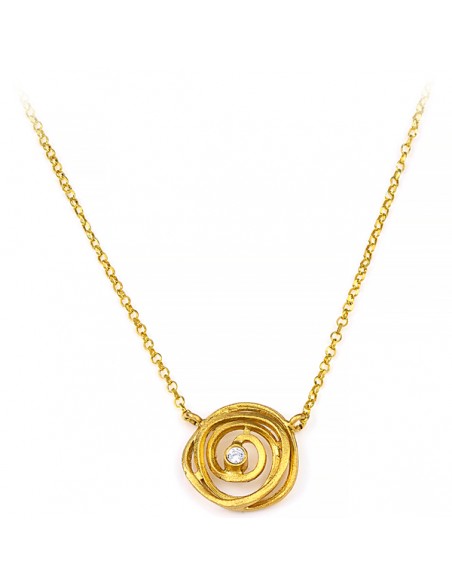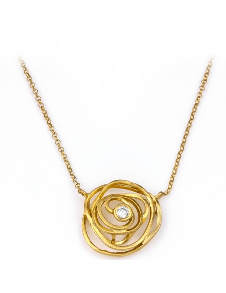 Ένα κομψό κολιέ σε ιδιαίτερο σχεδιασμό με σχέδιο λουλούδι, διακοσμημένο κεντρικά από πέτρα ζιργκόν.