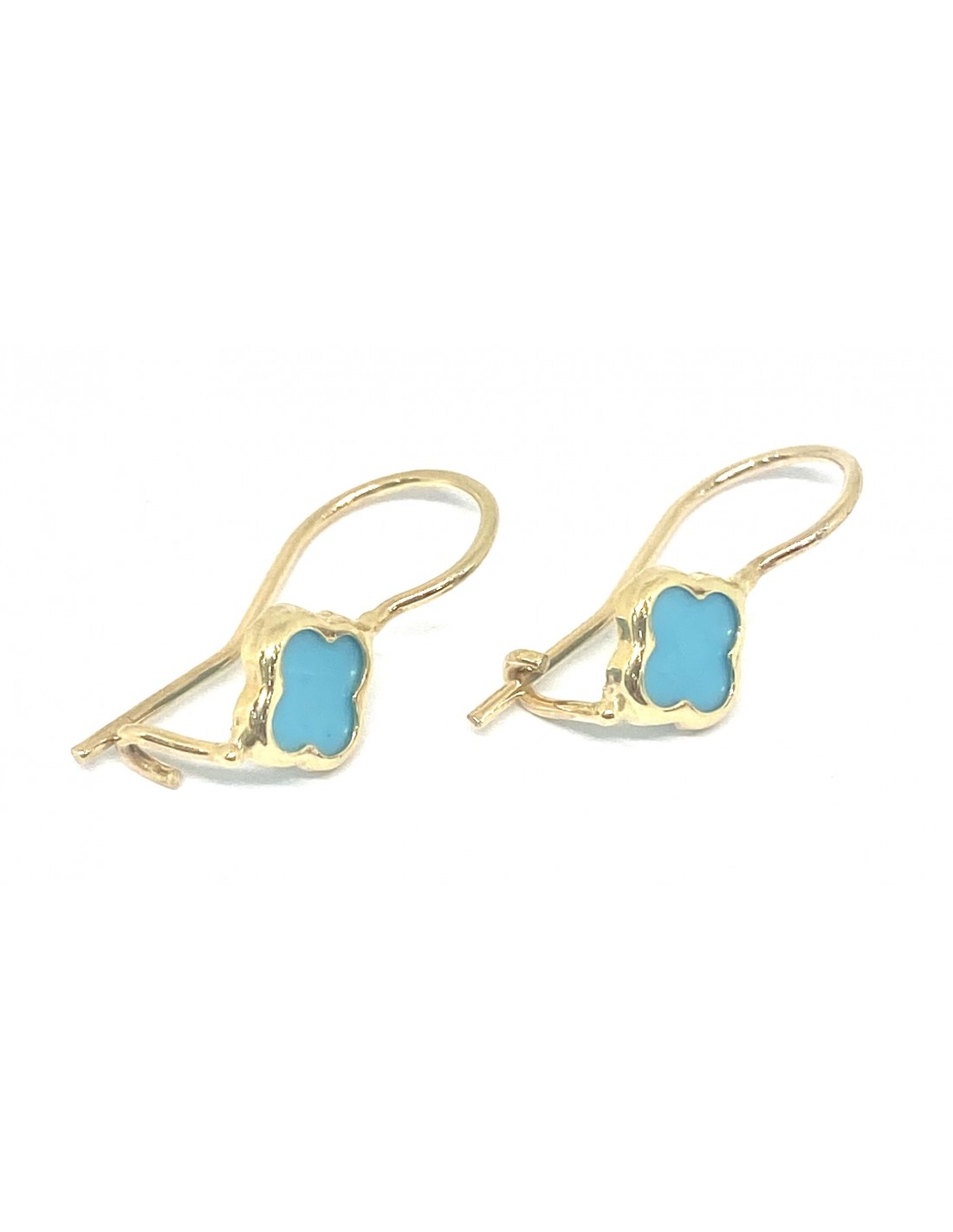 Κοσμήματα ΒαρουχάκηΚομψά και διακριτικά, αυτά τα χρυσά σκουλαρίκια διαθέτουν ένα όμορφο μοτίφ τετράφυλλου σε έντονο γαλάζιο χρώμα, που αποπνέει φρεσκάδα και καλοκαιρινή διάθεση.