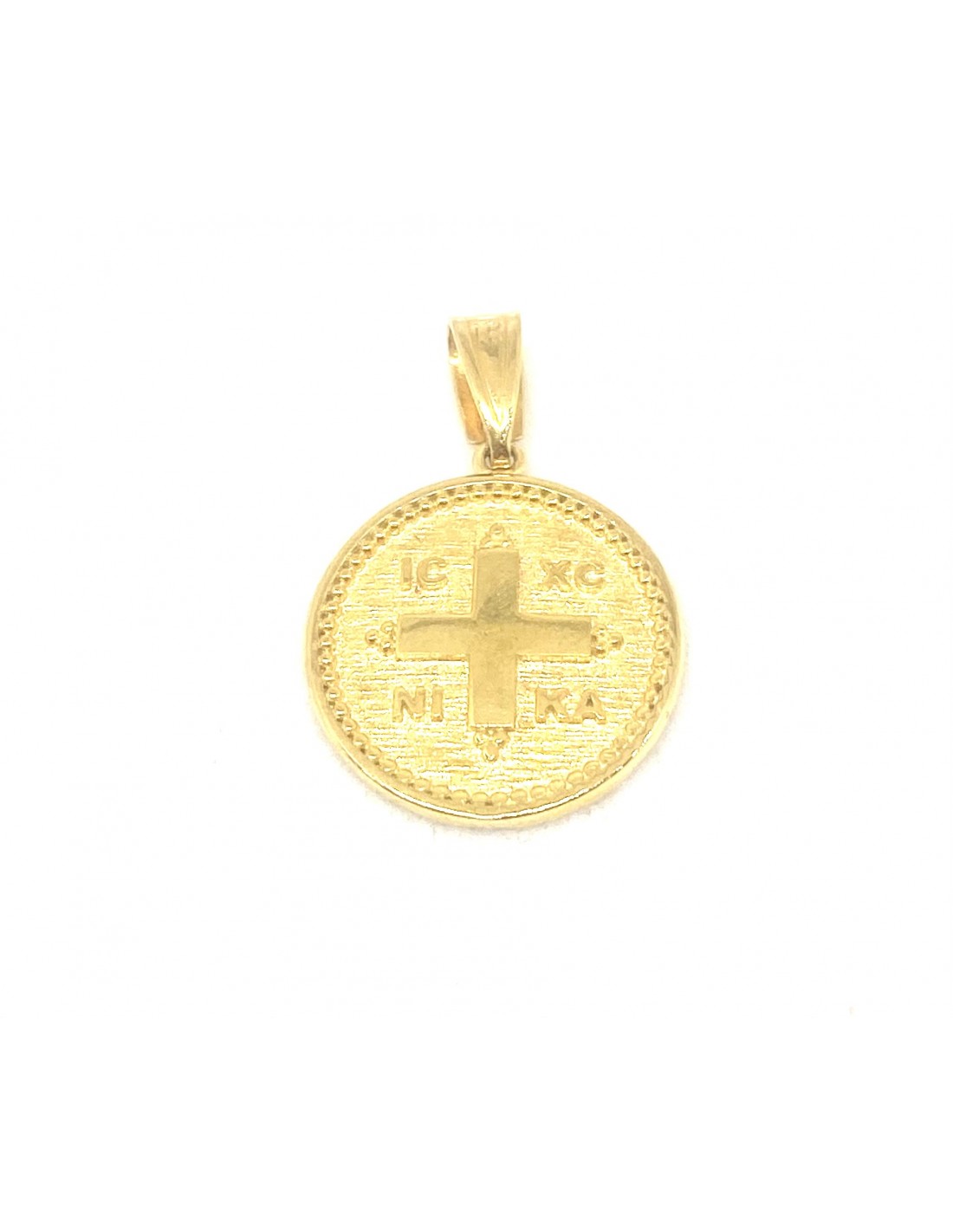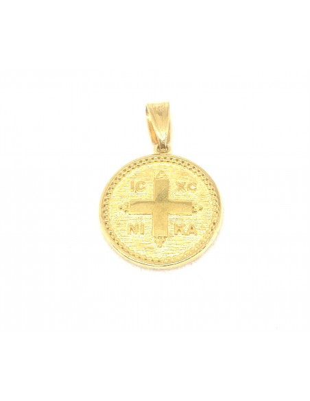 Κοσμήματα ΒαρουχάκηΣτρογγυλό χρυσό μενταγιόν IC XC NIKA με ανάγλυφο σταυρό στο κέντρο και περίτεχνο διάκοσμο στην περιφέρεια.
