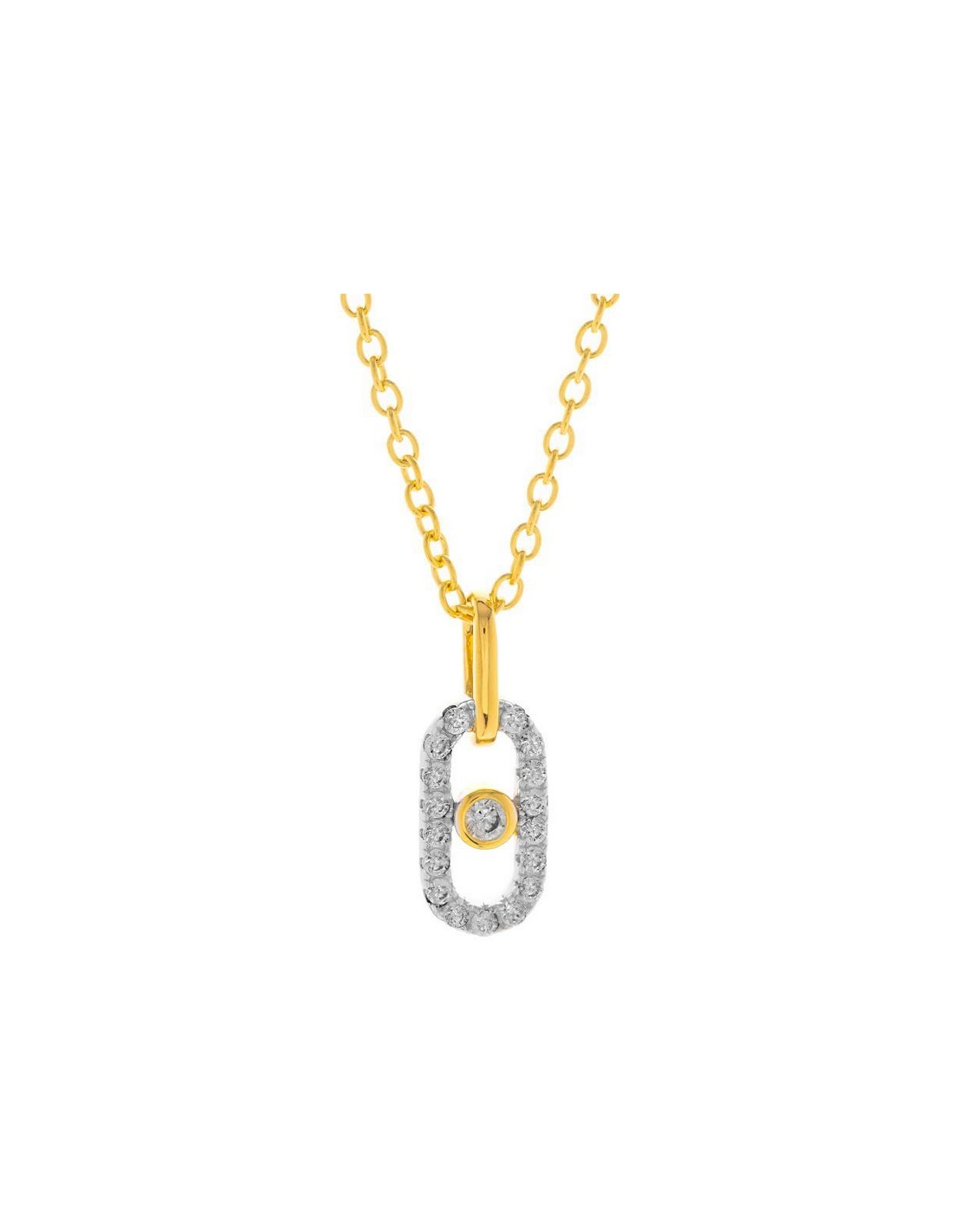 Κομψό κολιέ από κίτρινο χρυσό, με εντυπωσιακό μενταγιόν σε μοντέρνο γεωμετρικό σχέδιο. Το μενταγιόν αποτελείται από έναν επιμήκη, οβάλ κρίκο σε λευκόχρυση όψη, διακοσμημένο περιμετρικά με λαμπερά λευκά ζιργκόν υψηλής λάμψης. Στο κέντρο του σχεδίου δεσπόζει ένα επιπλέον ζιργκόν σε στρογγυλή κοπή, δεμένο σε χρυσή βάση, δημιουργώντας ένα κομψό contrast και προσθέτοντας βάθος και φωτεινότητα.