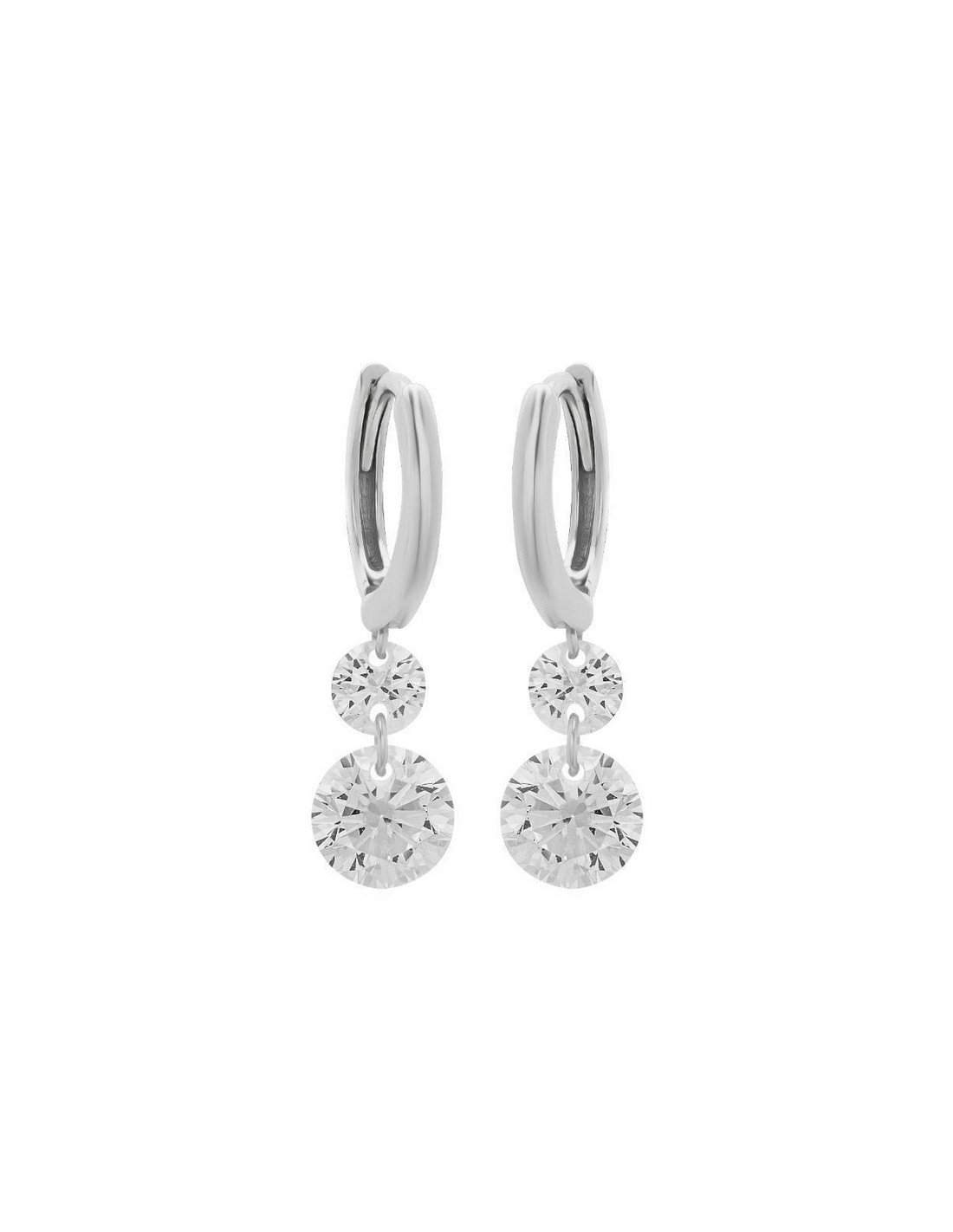 Κομψά σκουλαρίκια σε λευκό μέταλλο (λευκόχρυσος ή ασήμι), με διαχρονικό και ιδιαίτερα θηλυκό σχεδιασμό. Αποτελούνται από μικρού μεγέθους κρίκο με λεία, γυαλιστερή επιφάνεια, από τον οποίο κρέμονται δύο στρογγυλές πέτρες σε διαδοχική διάταξη.