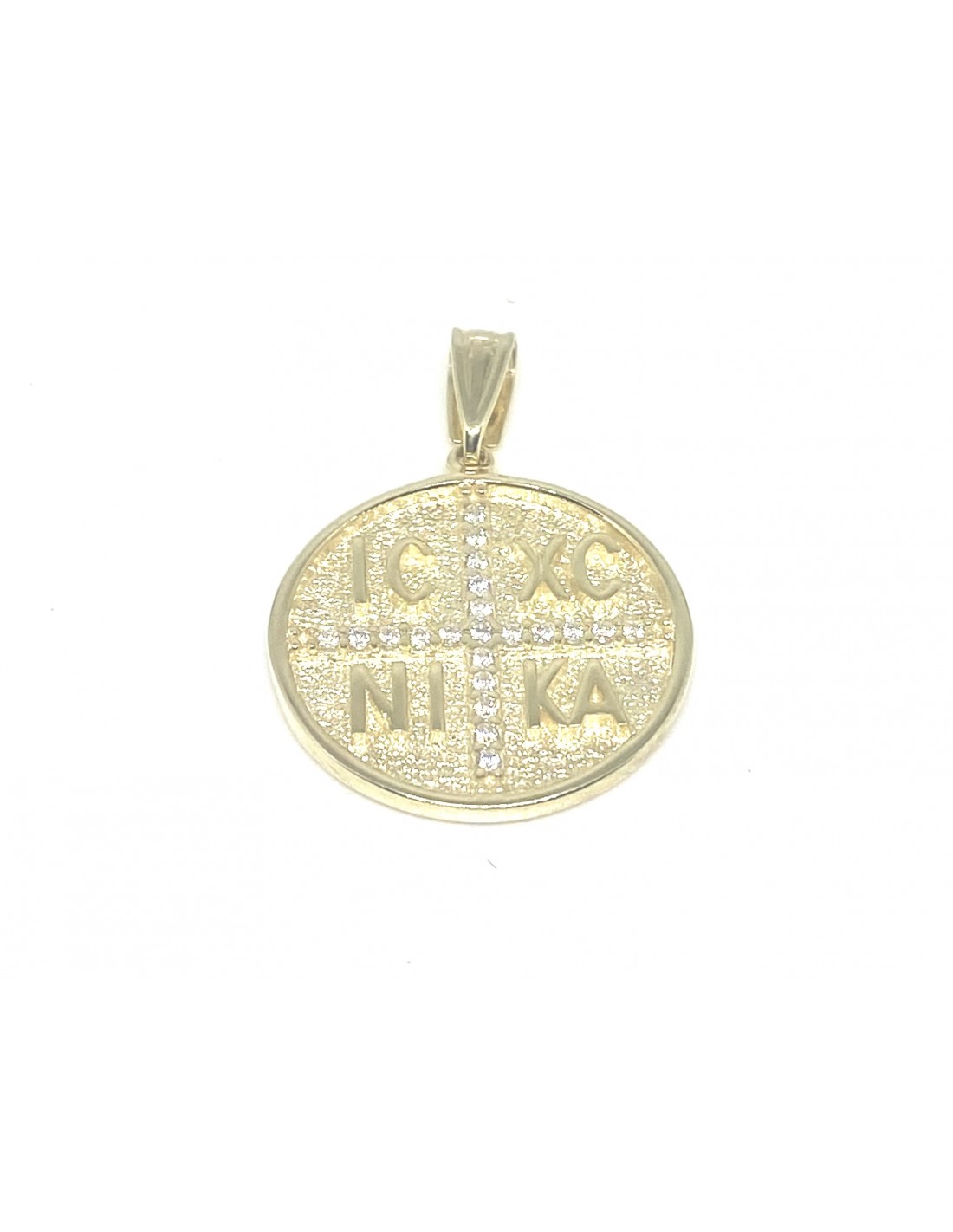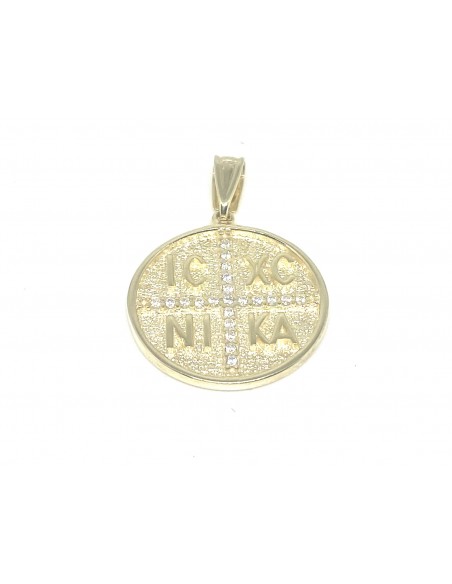 Κοσμήματα ΒαρουχάκηΕντυπωσιακό χρυσό φυλαχτό σε στρογγυλό σχήμα, διακοσμημένο με τον σταυρό και την επιγραφή IC XC NIKA, σύμβολο της ορθόδοξης πίστης που σημαίνει «Ιησούς Χριστός Νικά». Το σχέδιο εμπλουτίζεται με λαμπερές λευκές πέτρες ζιργκόν, τοποθετημένες επάνω στον σταυρό, χαρίζοντας μοναδική λάμψη και κομψότητα.
