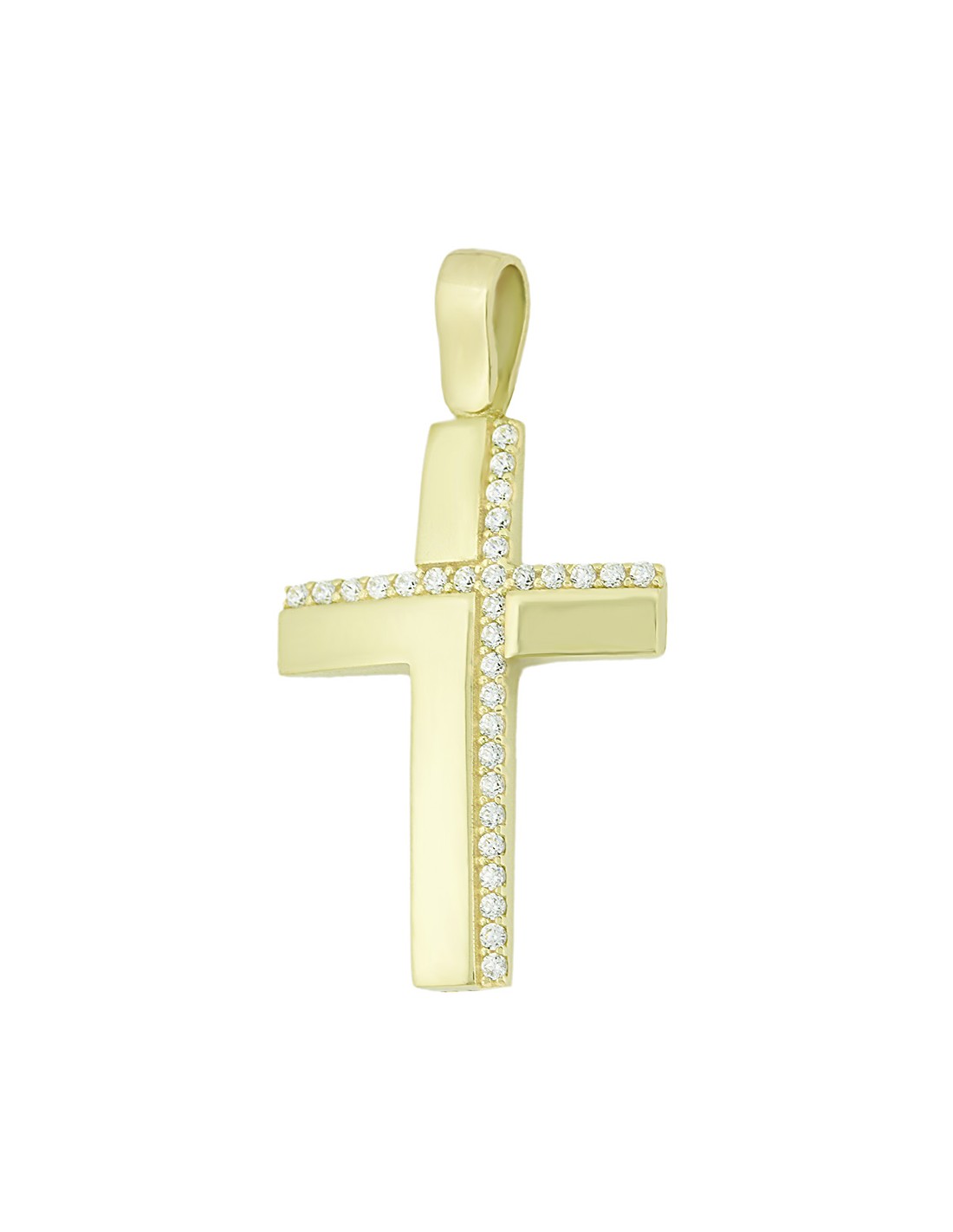 Διαθέτει λουστρέ φινίρισμα και σχήμα σταυρού στο πλάι από πέτρες ζιργκόν.