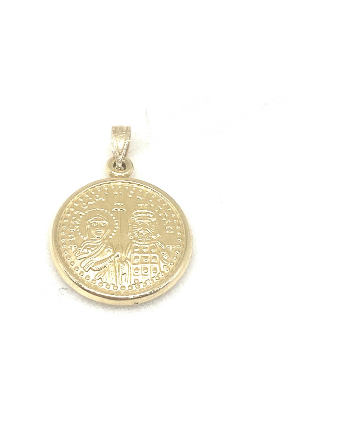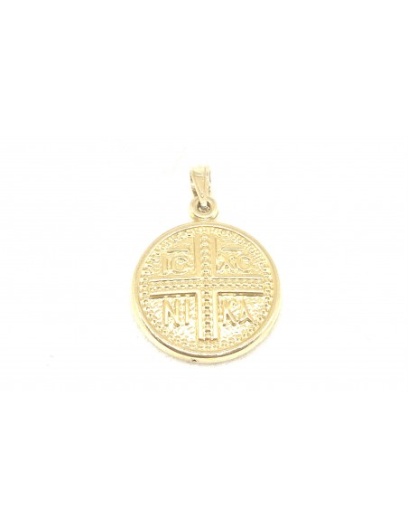 Κοσμήματα ΒαρουχάκηΜενταγιόν αγιοκωνστάντινο διπλής όψης κατασκευασμένο από χρυσό 9 καρατίων, 375. Διακοσμείται με διακριτικά στοιχεία με τους Αγίους Κωνσταντίνου & Ελένης και ICXC NIKA.
