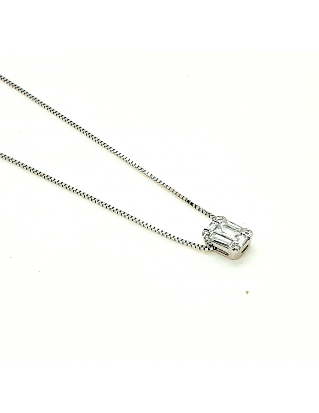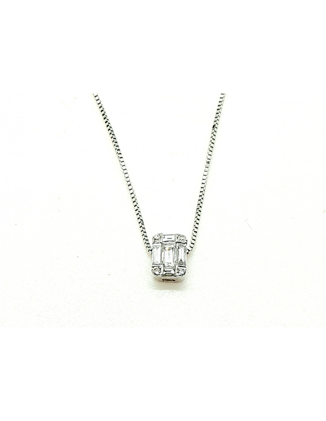 Ένα κολιέ λεπτεπίλεπτο και διαχρονικής αξίας κατασκευασμένο λευκόχρυσο 18 καρατίων, ορθογώνιο σχέδιο διακοσμημένο με διαμάντια Brilliant.