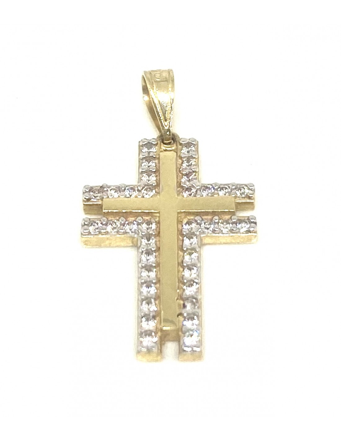 Κοσμήματα ΒαρουχάκηΈνας εντυπωσιακός διπλός σταυρός σε χρυσό, με διπλό περίγραμμα από λευκά ζιργκόν που αναδεικνύουν τον κεντρικό λιτό χρυσό σταυρό.