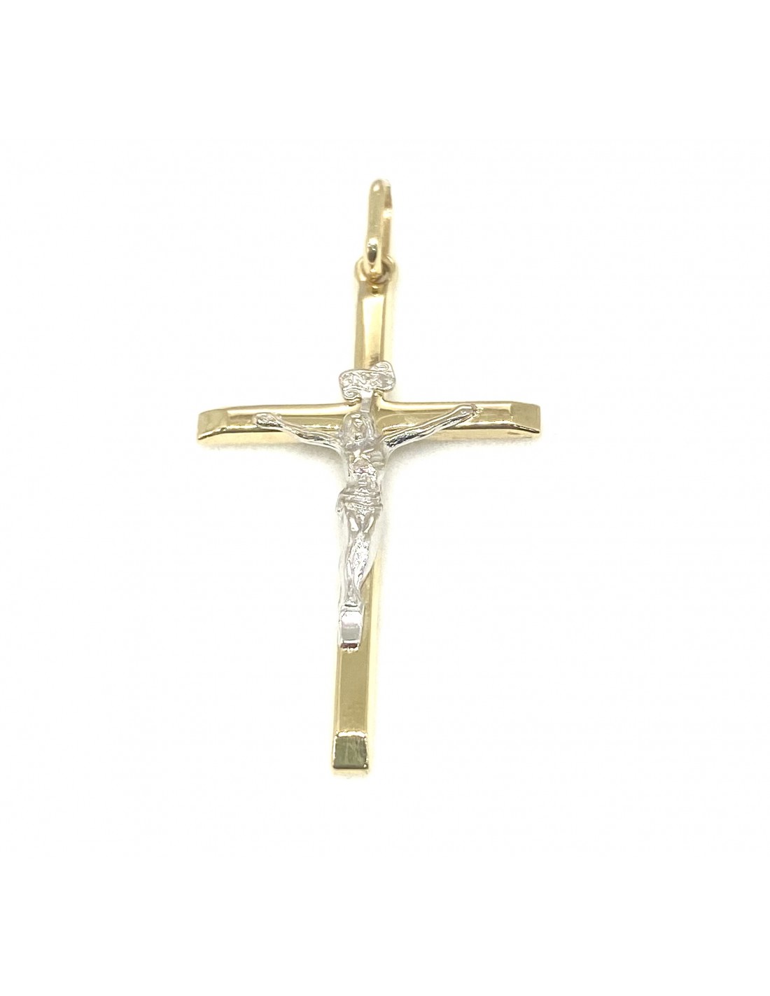 Κοσμήματα ΒαρουχάκηΚλασικός σταυρός με τον Εσταυρωμένο, κατασκευασμένος από κίτρινο χρυσό με δίχρωμη λεπτομέρεια. Ο σταυρός διαθέτει λιτή, γεωμετρική γραμμή με γυαλιστερό φινίρισμα, ενώ η μορφή του Χριστού αποδίδεται σε λευκόχρυση απόχρωση, δημιουργώντας έντονη αντίθεση και αναδεικνύοντας τις λεπτομέρειες του σχεδίου.