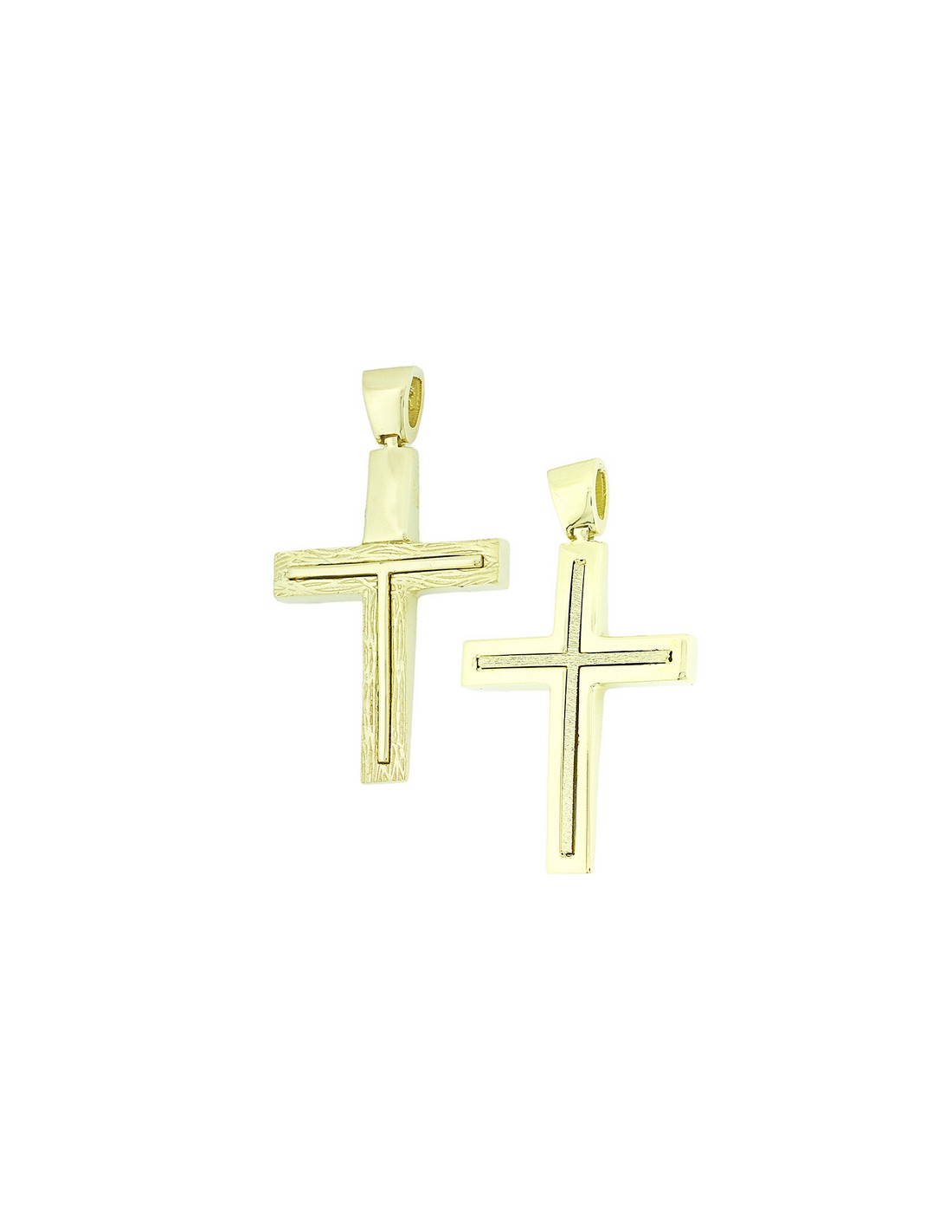 Κοσμήματα ΒαρουχάκηΚομψός σταυρός από χρυσό 14 καρατίων με διπλή όψη, που συνδυάζει κλασικό και minimal ύφος. Η μία πλευρά διαθέτει διακριτικό ανάγλυφο σχέδιο, ενώ η άλλη χαρακτηρίζεται από καθαρές γραμμές για πιο μοντέρνα εμφάνιση.
