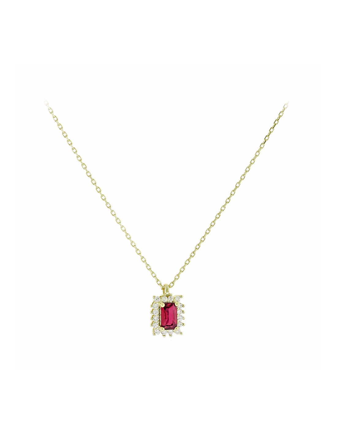 Χρυσό κολιέ ροζέτα σε 14 καράτια χρυσό 585, διακοσμημένο με μια κεντρική κόκκινη ζιργκόν πέτρα και περιμετρικά μικρές λευκές για περισσότερη λάμψη.
