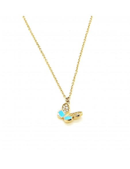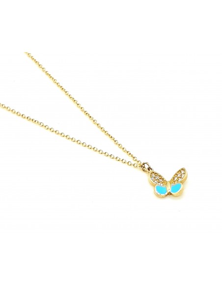 Κοσμήματα ΒαρουχάκηΚολιέ πεταλούδα κατασκευασμένο από χρυσό 14 καρατίων και διακοσμημένο με ζιργκόν πέτρες σε λευκό χρώμα και γαλάζιο σμάλτο.